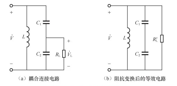 对并联谐振回路,将原电容 C 分割为 C1, C2 两个电感,并在 C2 上并联负载电阻 \(R_L\)。